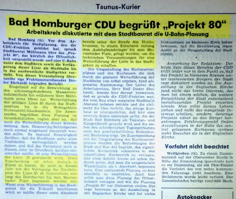 Bad Homburg. Vor dem Arbeitskreis für Stadtplanung, den die CDU-Fraktion gebildet hat, sprach Stadtbaurat Mühlmann über das "Projekt 80", das kürzlich der Öffentlichkeit vorgestellt wurde und eine U-Bahn unter dem Stadtkern sowie der Verlängerung dieser Linie als Stadtbahn bis in das nordwestliche Stadtgebiet vorsieht. Von dieser Veranstaltung übersandte uns Fraktionsvorsitzender Dieter Ehrhardt folgenden Bericht: