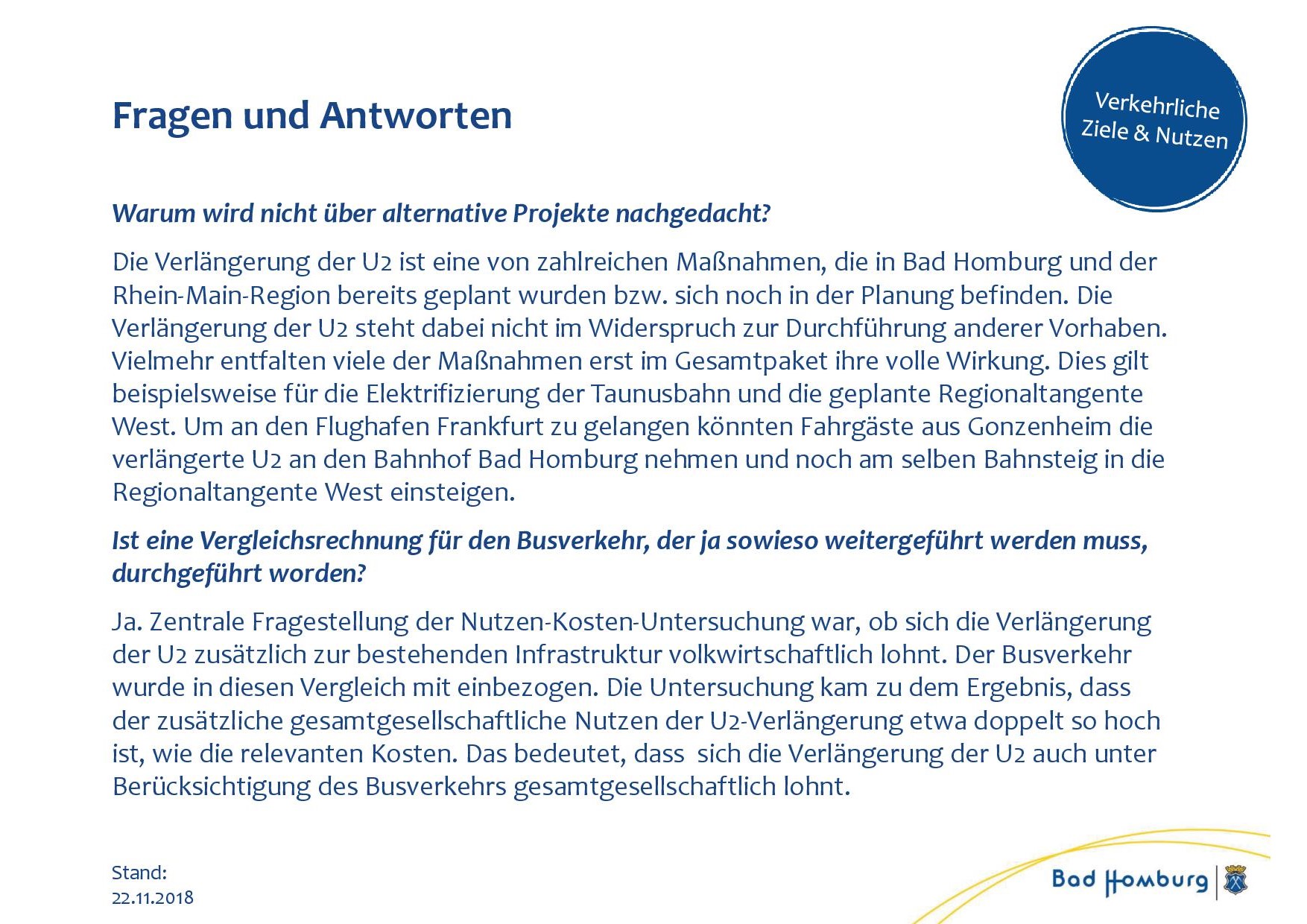 Mit Fortführung der U-Bahnlinie U2 bis zum Bahnhof Bad Homburg entfällt der 7,5 Minuten Takt in Hauptverkehrszeiten. Das gilt für Fahrten ab 7:02 bis 9:02 und abends ab 16:02 bis 18:54 Uhr. Insgesamt sind das 21 Fahrten / Werktag nach Frankfurt und 21 Fahrten zurück nach Bad Homburg. Zusammen entfallen 42 Fahrten von insgesamt 194 Fahrten / WT. Das entspricht 21,9%